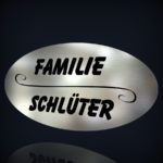 Text und Schriftart wie angegeben, Anordnung wie abgebildet (die Schriftgröße variiert je nach Anzahl der Zeichen)